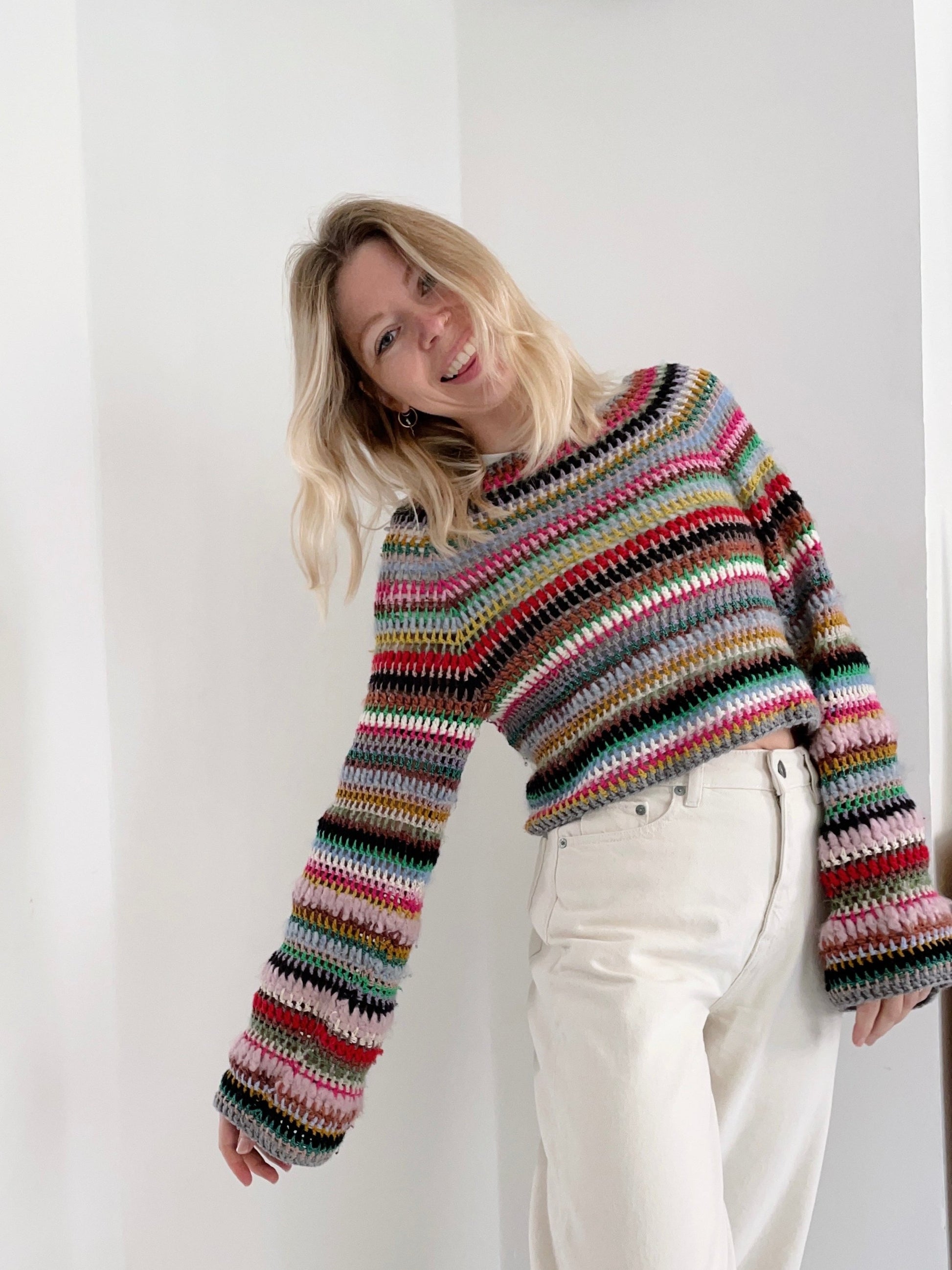 The Stash Buster is a crochet sweater pattern that's intended to clear out your yarn stash. It's a wonderful and easy pattern that gives you great opportunity to play around with different colors and textures.